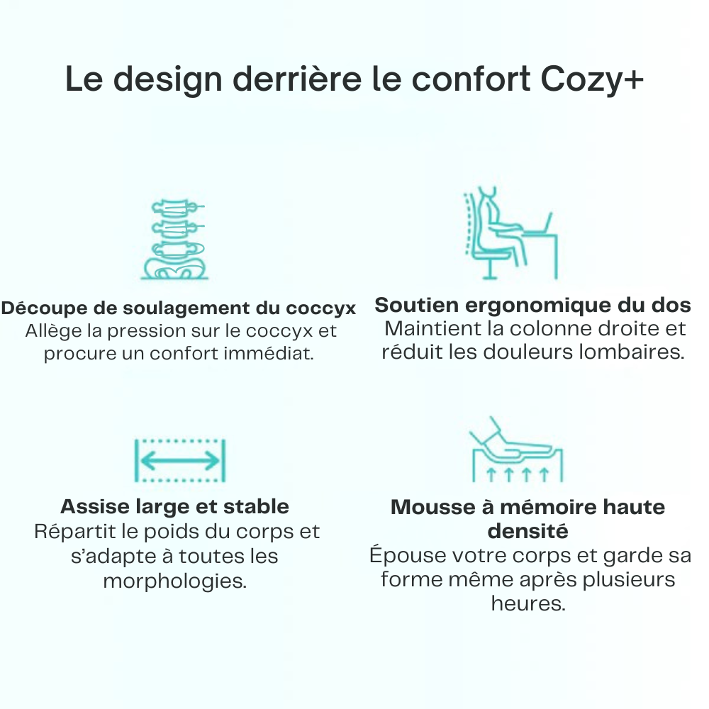 Le Cozy+ est conçu avec une mousse mémoire haute densité validée par des kinésithérapeutes pour soulager la pression au niveau du dos et du coccyx.